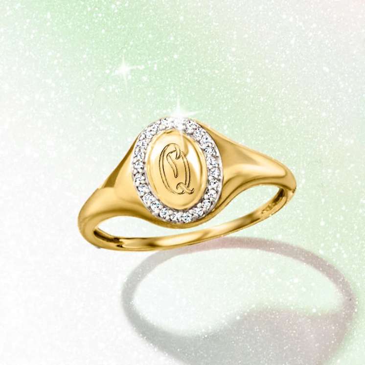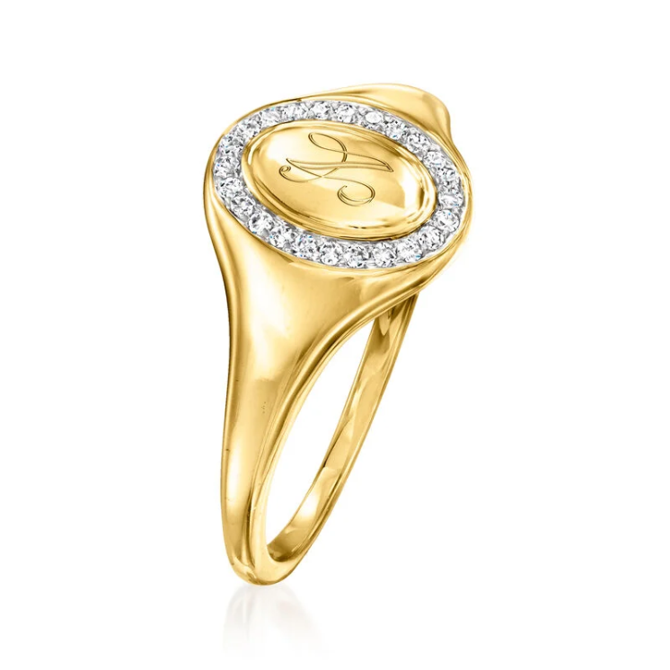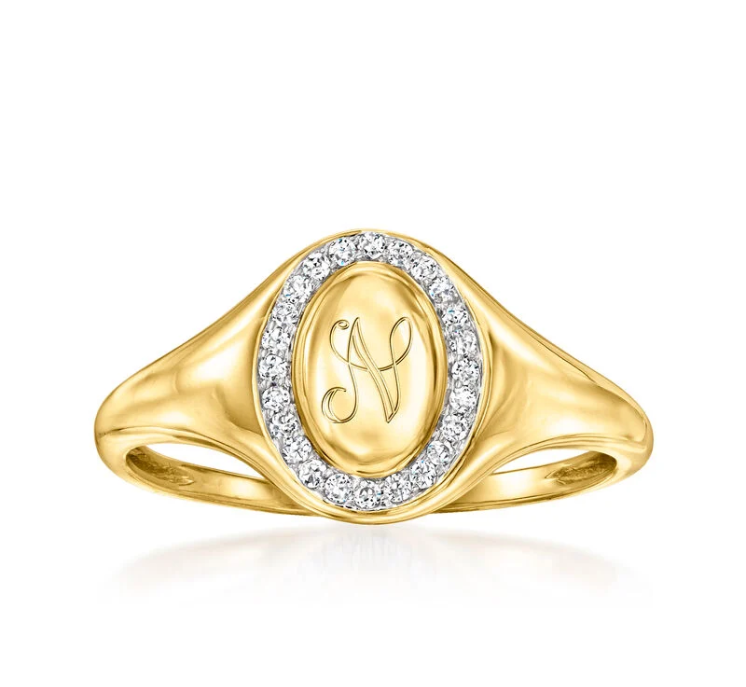 This exquisite classic signet ring offers a modern interpretation of a timeless design. It features a band of round diamonds totaling 0.10 carats and is crafted in polished 14K gold, creating a dazzling effect. You can also choose to have a single letter engraved free of charge, with options for printed or handwritten fonts, making the ring even more unique. The ring is 3/8 inch wide.