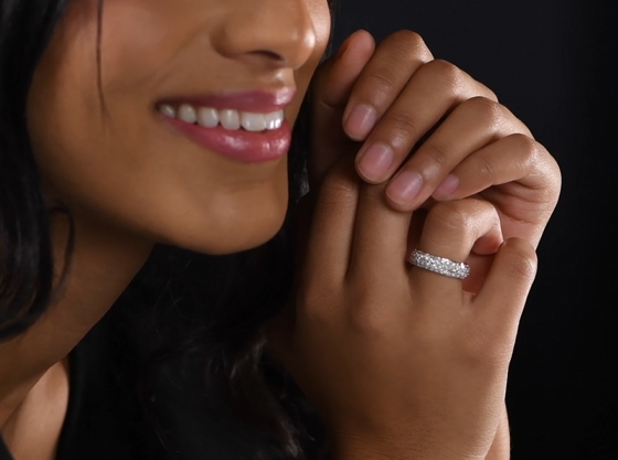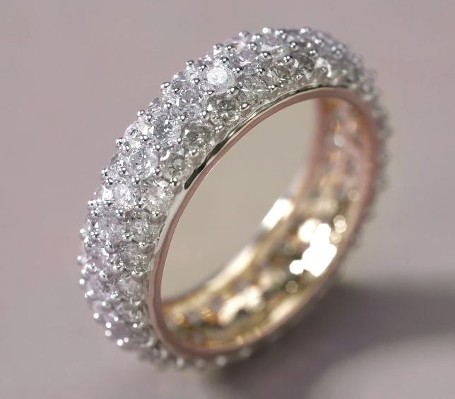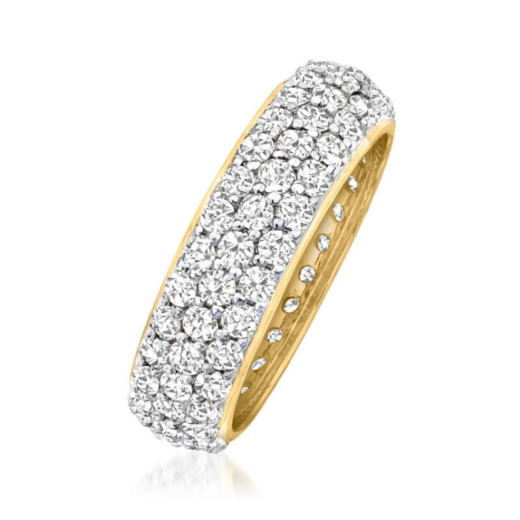This ring, crafted in 14K polished gold and set with 3.00 carats of micro-paved diamonds, is dazzlingly beautiful. It makes a perfect anniversary gift and complements your engagement and wedding rings. The ring is 1/4 inch wide. A timeless micro-paved diamond ring.