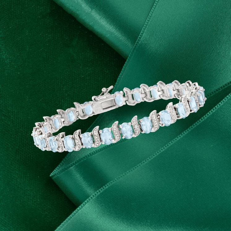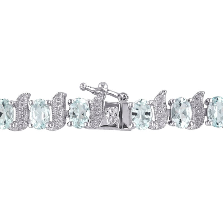 This classic tennis bracelet is set with 9.50 carats of oval-shaped aquamarines and diamonds, dazzlingly beautiful, while the gracefully curved links add a modern touch. Crafted from polished sterling silver, the bracelet is lightweight and elegant, a delight to behold. As the birthstone for March, it is also a perfect choice for a special occasion. It features a figure-eight security clasp and a box clasp.