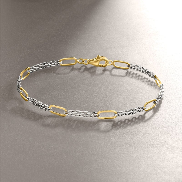 This bracelet features a unique two-tone design, alternating between lustrous sterling silver cable links and slender 18K gold-plated sterling silver paperclip links. It comes with a lobster clasp, and the links are made of 18K gold-plated sterling silver, sterling silver cable links, and paperclip links.